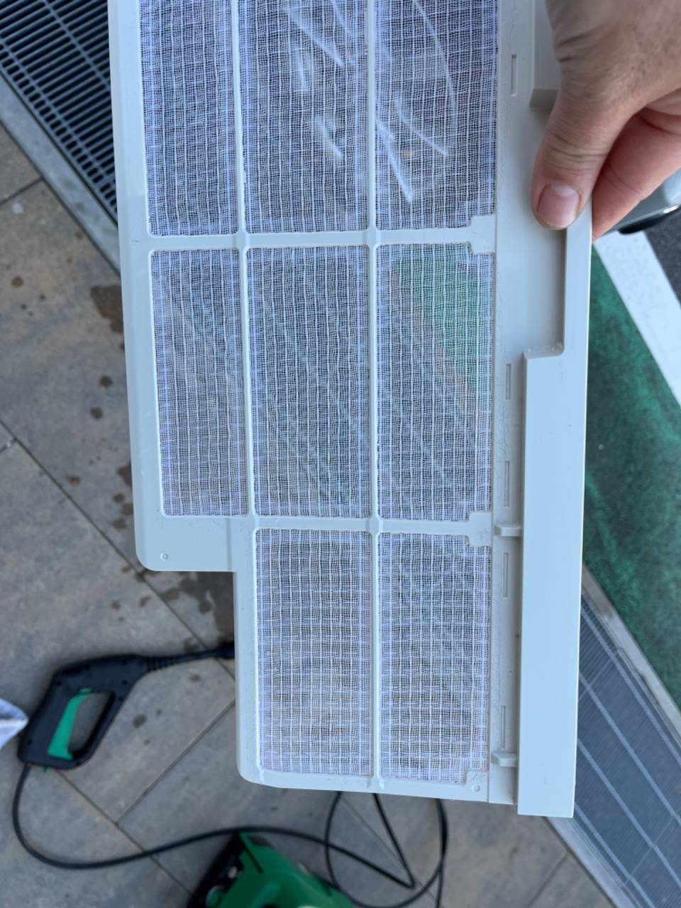 一度もフィルター掃除をされていないとのことで点検させていただきましたところ、ホコリがぎっしり付いていました。乾燥や暖房、換気の効率も下がり、電気代も上がるため定期的なお掃除をおすすめします。フィルターの洗い方は柔らかいブラシを使用して中性洗剤で汚れを取り、水で洗い流して水分をふき取ります。