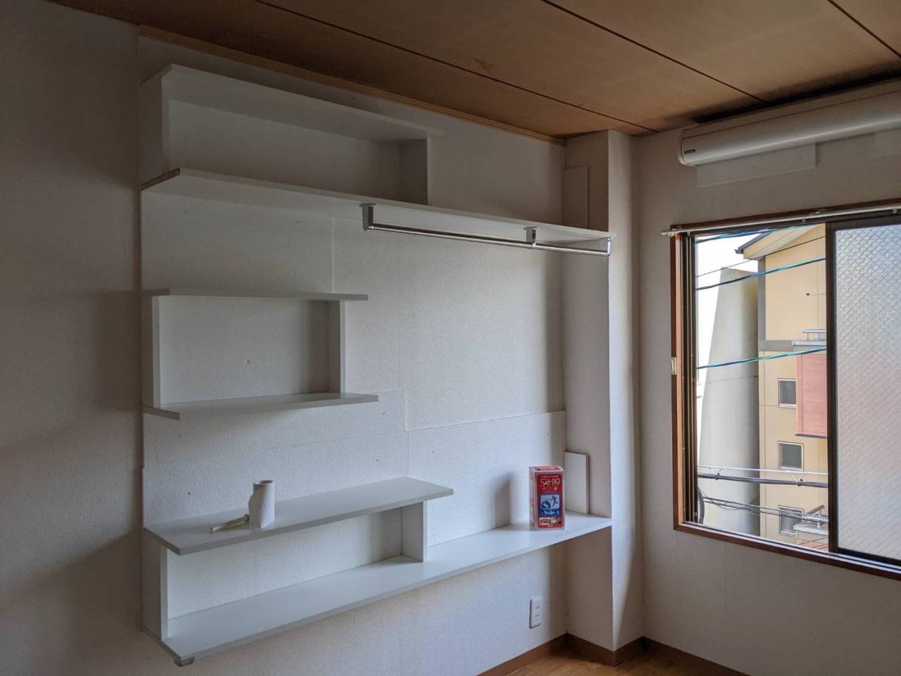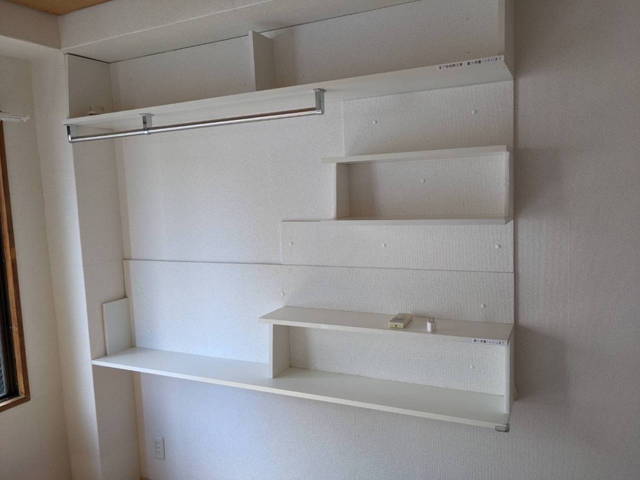 収納スペースが少ない為、入居されるお客様が困るとのことでご依頼をいただきました。壁に合わせて材料や固定方法を選択してハンガーレール等もお取付させていただきデッドスペースを有効活用しました。
