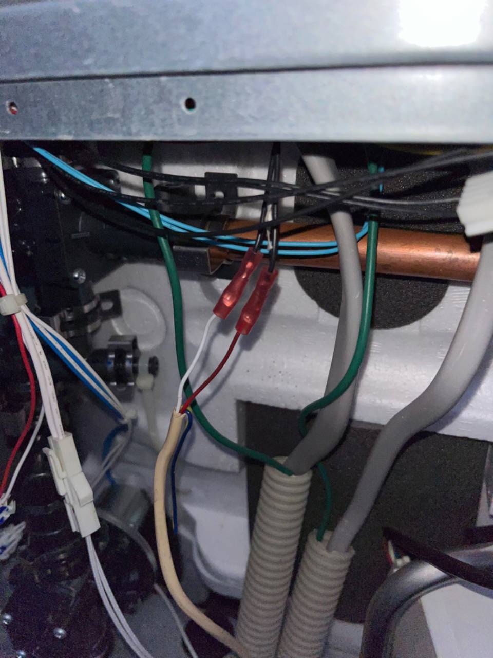 メーカー保証がある為、メーカーに電話をしてサービスの方に来ていただきテスターで点検していただきました。リモコン部まで電気が来ていないため基盤がダメになっている可能性が高いという診断でしたが、直接基盤にリモコンを接続すると操作ができることが確認できたので基盤は大丈夫とのことでした。考えられる原因として室内に二つのリモコンがあり、分岐しているところが断線している可能性が高いとのことでしたが、電気配線修理はメーカー補償対象外とのことでしたので当社で点検させていただきました。基盤から出ているリモコン用の配線をたどっていくと分岐しているところを発見!水がかかりさびて断線していましたので絶縁被覆付閉端接続子 (CE形)を使い接続しましてリモコンを確認しましたところバッチリ表示していました。